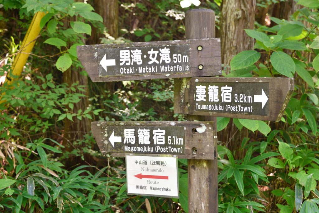 In Magome en Tsumago staat de wandeling goed aangegeven. Bij de start staat een bord die de route uiteenzet en ook tijdens de wandeling komen we heel wat wegwijzers tegen, in beide richtingen.